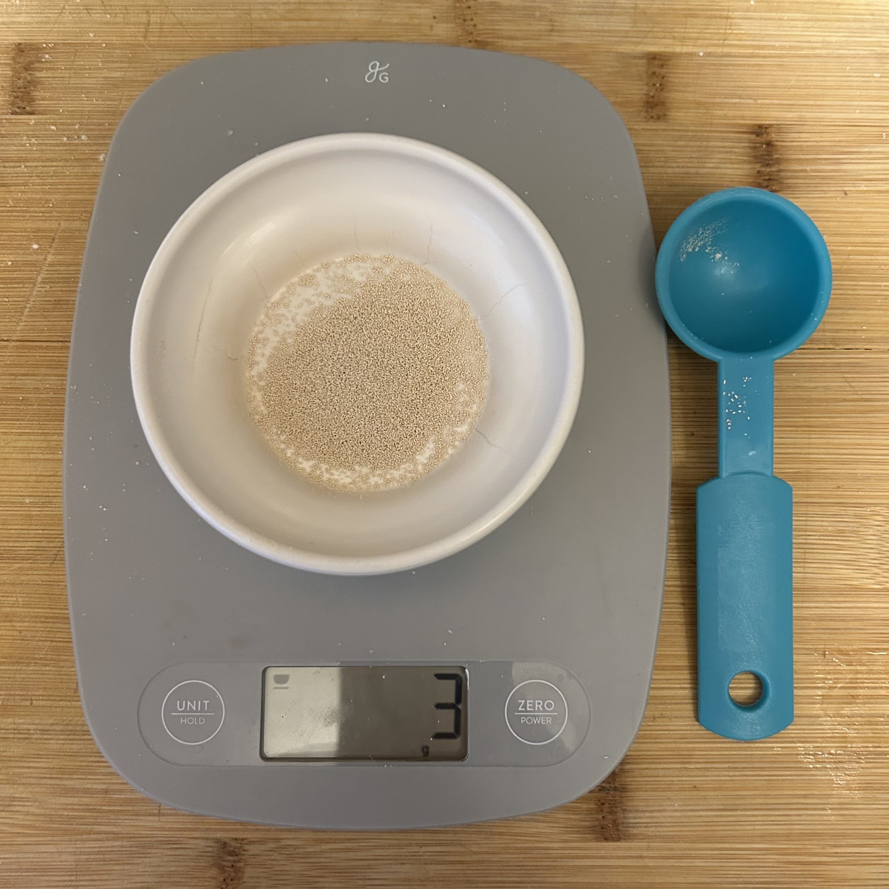 First and foremost, we needed to acquire a Dutch oven to make the recipes in this book, which we did with the help of our local Buy Nothing group. We were already in possession of another baking essential, an electronic kitchen scale. While the recipes’ ingredients are listed by both weight and volume, measuring by weight will be more precise. As we learned, precision is key with baking bread, from the measurement of ingredients, temperature of not only the oven but the room, and time to rise. Finally, because the recipes yielded two loaves, we wanted to buy proper storage for our extra loaf. I ordered a beeswax bread bag from Sarah Belle’s Soap and More of Holland, NY.